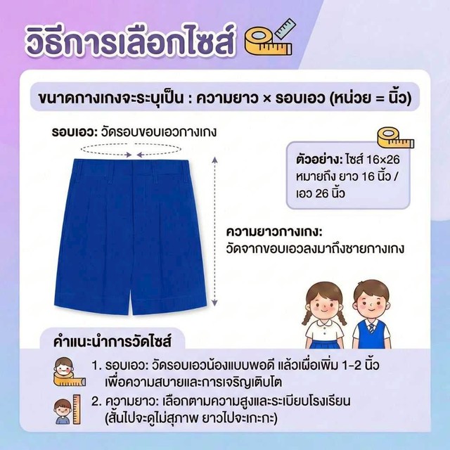 1. วัดเอว: ใช้สายวัดวัดรอบเอวน้องแบบพอดี แล้ว "บวกเพิ่ม 1-2 นิ้ว" (เผื่อมื้ออาหารและเผื่อโต) หรือวัดจากกางเกงตัวเดิมที่ใส่พอดี