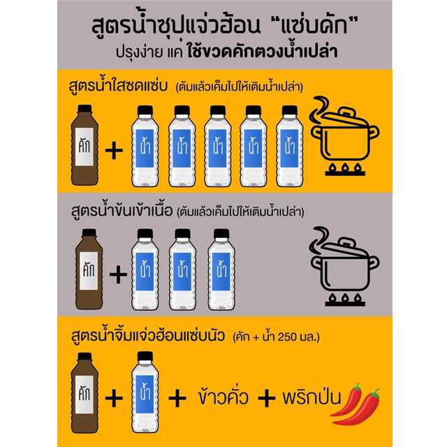 วิธีรับประทาน ต้ม น้ำซุปเข้มข้น 1 ขวด ต่อปริมาณน้ำเปล่า 750 มล. หรือ 1 ต่อ 3 สามารถลด หรือเพิ่ม ปริมาณน้ำเปล่าได้ตามความเข้มข้นที่ชอบ เมื่อน้ำซุปเดือด ใส่หมู เนื้อผัก และอื่นๆตามชอบ อร่อยได้โดยไม่ใต้องใช้น้ำจิ้ม สำหรับคนติดจิ้ม ใช้คัก ผสมน้ำเปล่าอัตราส่วน 1:1 ปรุงรสตามชอบ