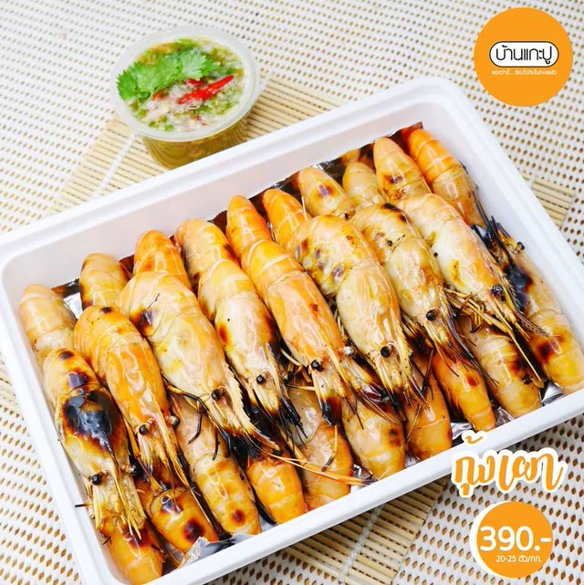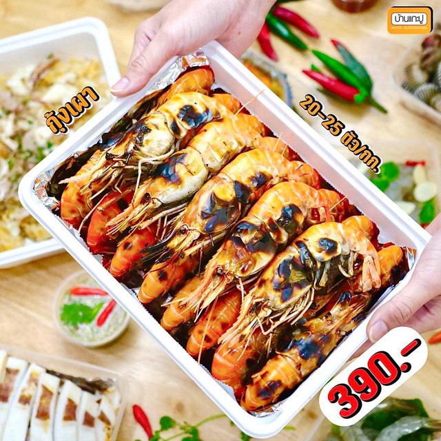 - กุ้งเผา 390 บาท/กล่อง (1 กก. 20-25 ตัว)