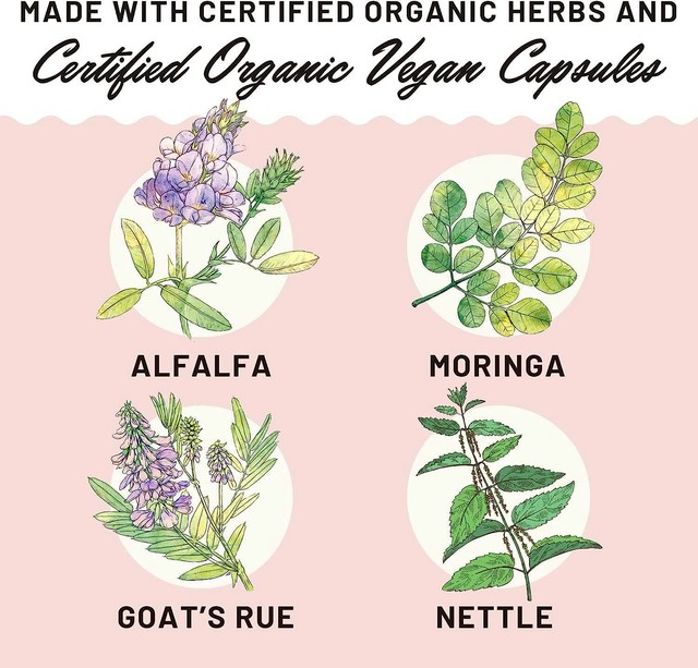 Organic alfalfa อัลฟัลฟ่า (ใบ), organic moringa มะรุม (ใบ), organic goat’s rue (สมุนไพร), organic nettle ใบตำแย , แคปซูลผลิตจากพืช