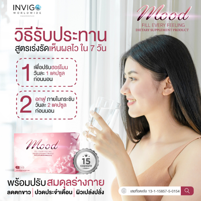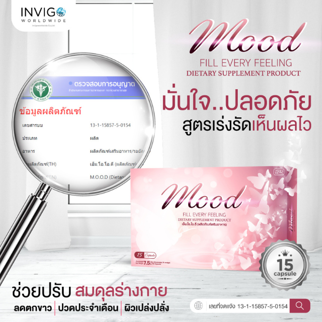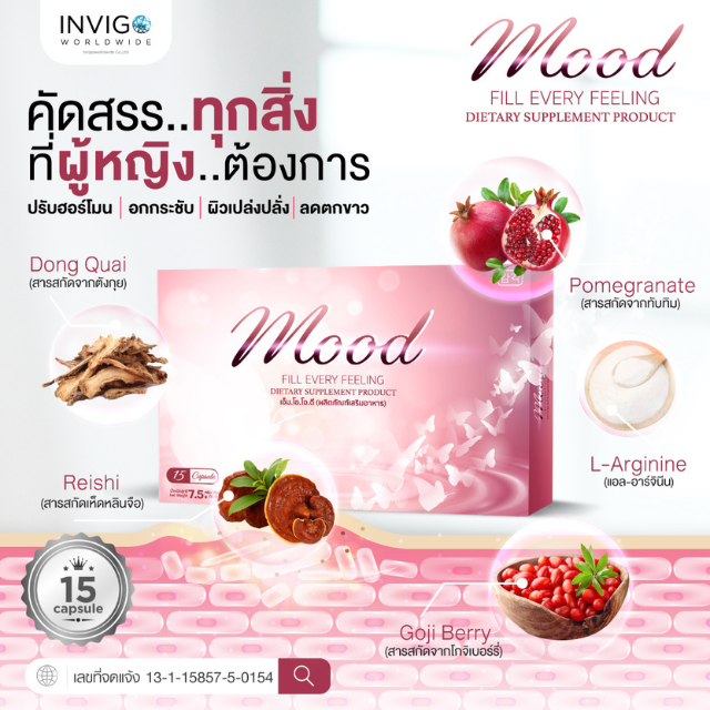 อาหารเสริมผู้หญิง Mood เป็นผลิตภัณฑ์เสริมอาหาร เหมาะสำหรับสุภาพสตรีโดยเฉพาะ ช่วยต่อต้านความเสื่อมแห่งวัย เติมเต็มความเป็นหญิงให้กับคุณ แก้ปัญหาวัยทอง เสริมสร้างระบบภูมิคุ้มกัน ปรนนิบัติผิวคุณให้ขาว สว่างใส แลดูผิวอ่อนเยาว์อย่างเป็นธรรมชาติ มีสรรพคุณช่วยทำให้ผู้ที่เคยมีปัญหาเรื่องผิวพรรณแห้งหยาบกร้าน ให้กลับมามีผิวพรรณเปล่งปลั่งสดใส