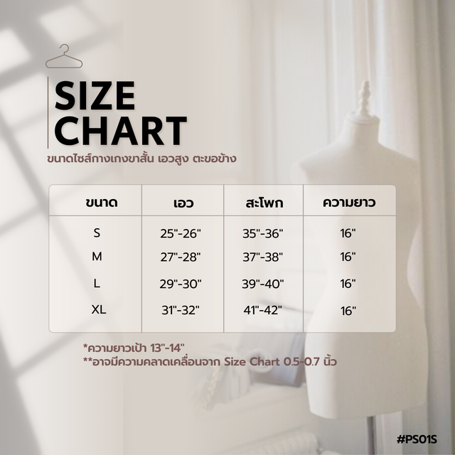 - S : เอว 25"-26" สะโพก 35-36"