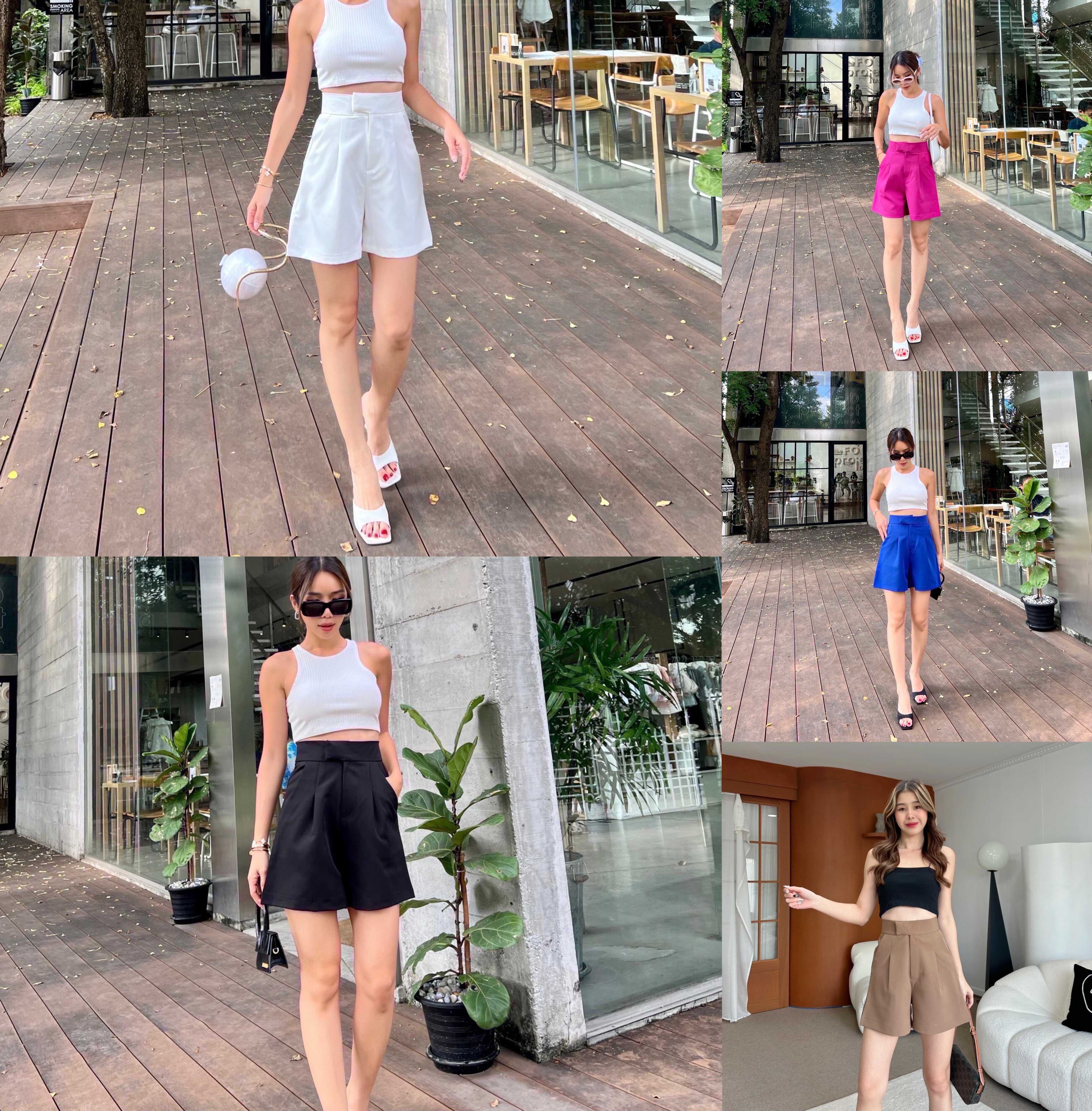 กางเกงขาสั้น เอวสูงปิดสะดือ มาพร้อมดีเทลตะขอข้าง เพิ่มลูกเล่นให้การแต่งตัวไม่น่าเบื่อ และความยาวกางเกงกำลังดีไม่โป๊แมทช์ง่ายได้ทุกลุกซ์