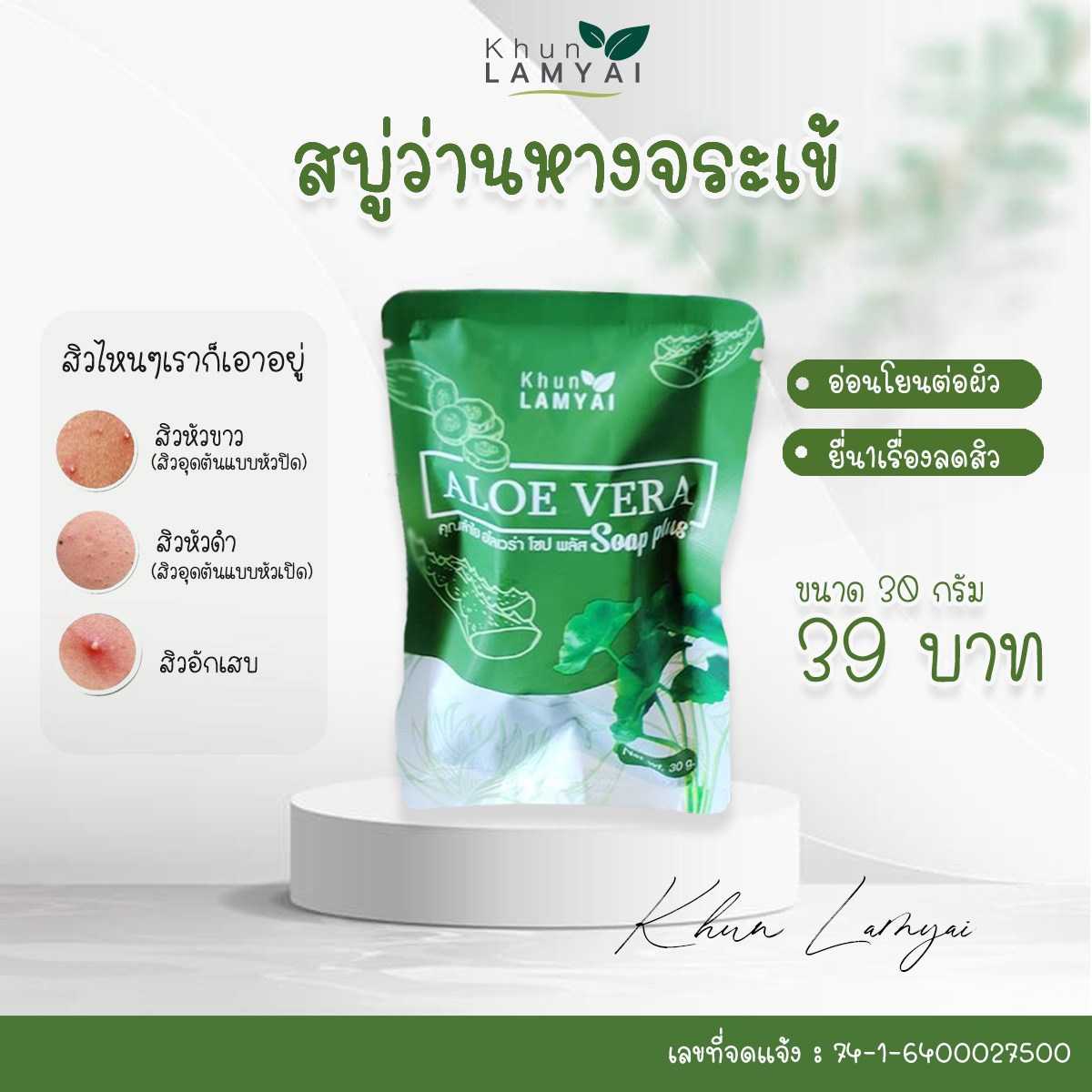 ALOE Soap ( Khun Lamyai) สบู่ว่านหางจระเข้ใบบัวบก สูตรอ่อนโยน ขนาด 30กรัม แถมถุงตีฟอง