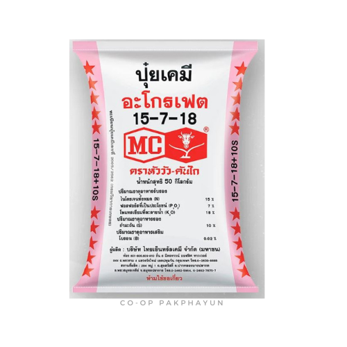 ปุ๋ยเคมี อะโกรเฟต 15-7-18 ตราหัววัว-คันไถ