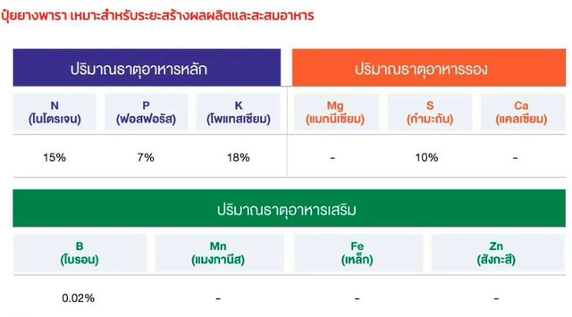 เป็นปุ๋ยใส่บำรุงต้น โดยเฉพาะยางพารา เปิดกรีดทำให้เปลือกยางนิ่ม กรีดง่ายปริมาณน้ำยางพารา เพิ่มมากขึ้น น้ำยางเข้มข้นขึ้น นอกจากนี้ยัง เหมาะสำหรับพืชไร่ พืชผัก ไม้ผล และไม้ดอก ไม้ประดับ ทุกชนิด ขนาดบรรจุ 50 กิโลกรัม