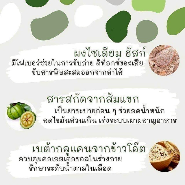มีส่วนผสมของอินูนิน/โอลิโกฟรุคโตส, ผงไซเลียมฮัสก์, สารสกัดจากผลส้มแขก, เบต้ากลูแคนจากรำข้าวโอ๊ต, ผงราสพ์เบอร์รี่, ผงแครนเบอร์รี่, สารสกัดจากอะเซโรล่าเชอร์รี่, ผงใบข้าวสาลี, แอล-ออร์นิทีน