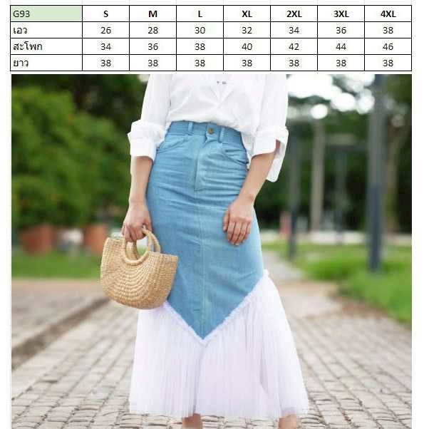 กระโปรงยีนส์แต่งระบายสีขาวมุ้ง ทรงรูปตัว V - G93