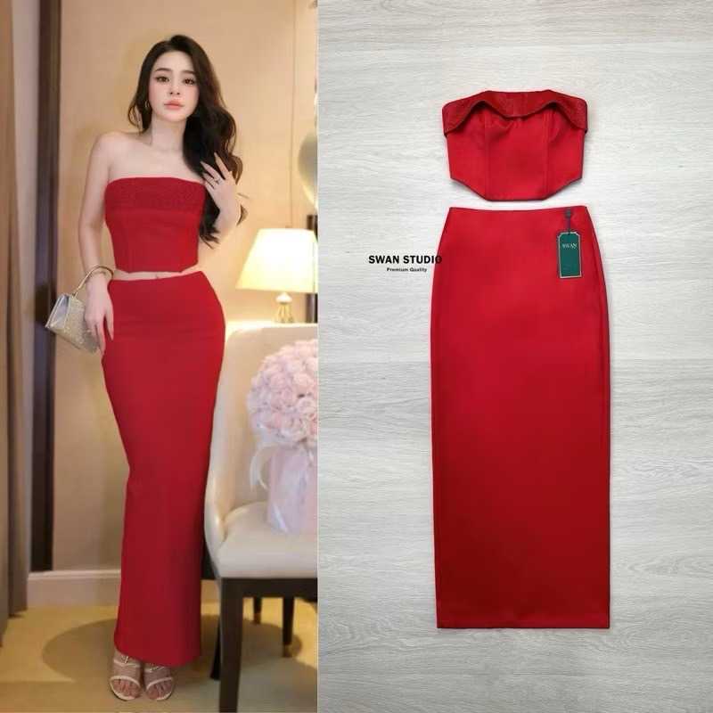 Detail : Set เสื้อเกาะอกสีแดง มีพับขอบด้วยผ้ากลิตเตอร์ ตีเกร็ดตรงกลาง + กระโปรงสอบยาว สวยแซ่บแบบติดแกลม