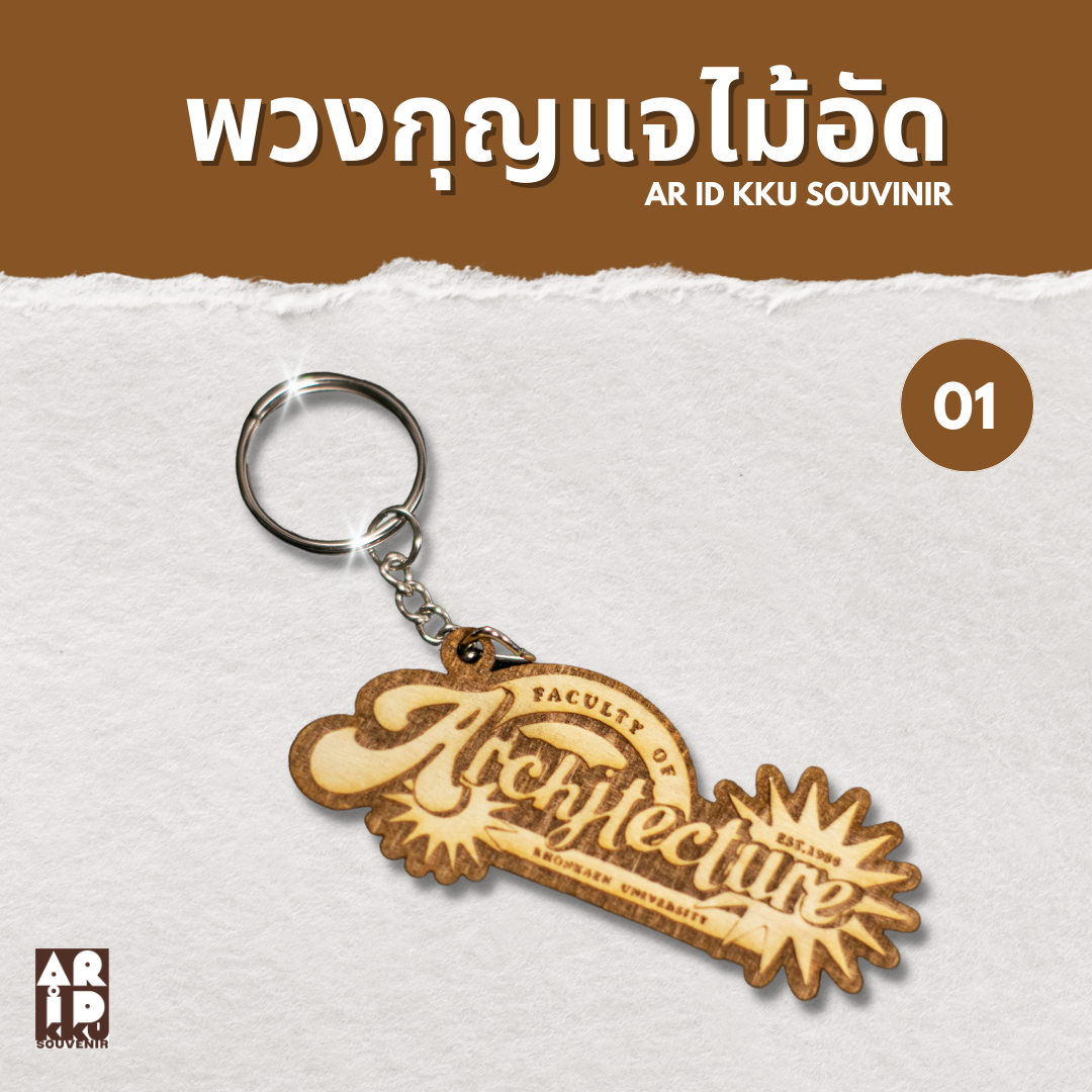 พวงกุญแจไม้อัด แกะสลักด้วยเครื่องเลเซอร์ ออกแบบลวดลายโดยนักศึกษาสาขาการออกแบบ (กราฟิกและมัลติมีเดีย) คณะสถาปัตยกรรมศาสตร์ มข.