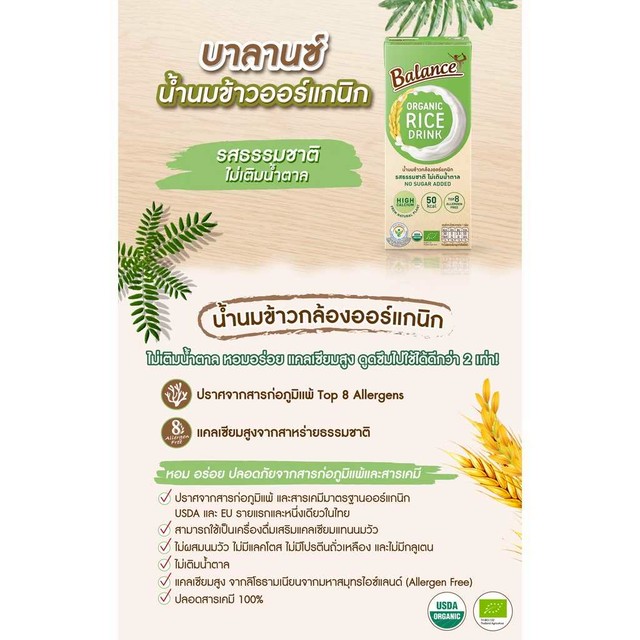 เครื่องดื่มน้ำข้าวหอมมะลิออร์แกนิก รสธรรมชาติ ไม่เติมน้ำตาล ปราศจากสารก่อภูมิแพ้และสารเคมี อุดมด้วยแคลเซียมธรรมชาติที่แสนบริสุทธิ์ จากสาหร่ายลิโธธามเนียน ในมหาสมุทรไอซ์แลนด์ ปลอดสารก่อภูมิแพ้หลัก 8 ชนิด