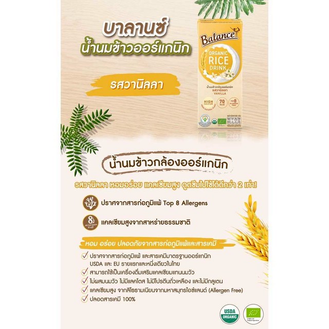 BALANCE ORGANIC Rice Drink – Vanilla ทุกหยดมั่นใจปลอดภัยไร้สารเคมี ไม่มีสารก่อภูมิแพ้ แคลเซียมสูงจากธรรมชาติ