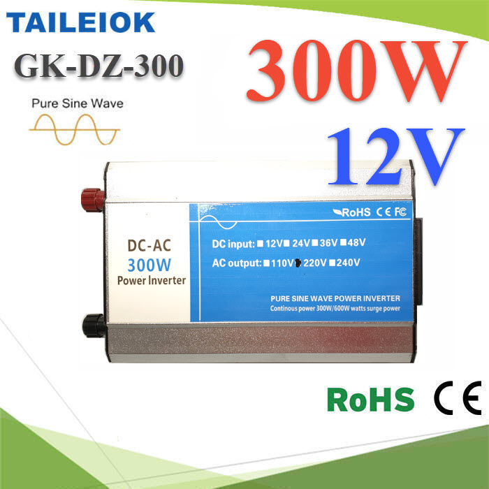 Inverter Pure sine wave AC220V 300W input DC 12V. Perfect performance controlled by advanced CPU. Protection functions low-voltage protection over-voltage protection, Over temperature protection, overload protection, short circuit protection, reverse polarity protection. battery over-discharge alarm protection, and shockproof.