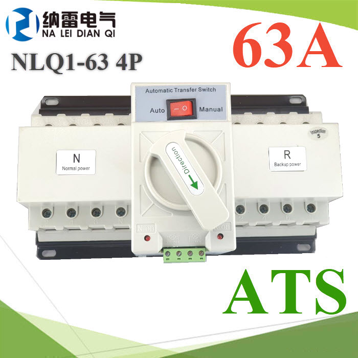 เบรกเกอร์สวิทช์ 2 ทาง ATS เปลี่ยนเส้นทางการจ่ายระบบไฟฟ้า สลับการจ่ายไฟฟ้า ระบบอัตโนมัติ 4P 63A Automatic transfer switch Circuit breaker MCBเมื่อฝั่งซ้าย input ด้านบนมีไฟเข้ามาป้อน ระบบจะมาใช้ไฟฝั่งซ้ายเสมอเป็นไฟหลัก หากฝั่งซ้ายไม่มีไฟมาป้อน ระบบจะสลับไฟไปใช้ฝั่งขวาทันที และเมื่อฝั่งซ้ายมีไฟเข้ามาตามปกติ ระบบก็จะตัดไฟมาใช้ฝั่งซ้ายอีกครั้ง มีสวิทช์เลือกการสลับไฟ แบบอัตโนมัติ หรือปรับด้วยตัวเองได้