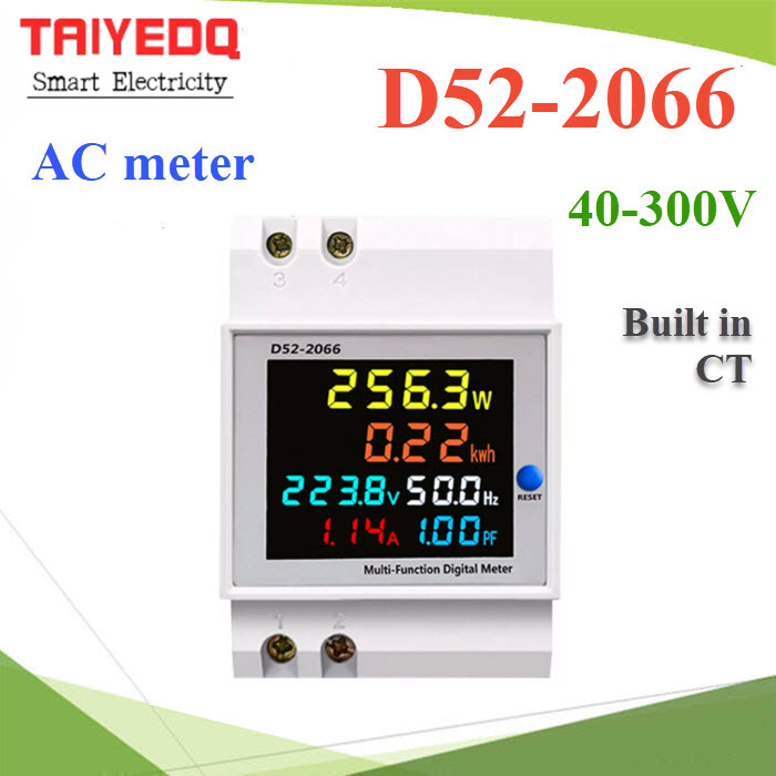 มิเตอร์วัดพลังงานไฟฟ้า รุ่น D52-2066 AC Single phase ขนาด 40V-300V 0A-100A Din Rail Dual Display LED Ammeter Voltmeter Voltage Current Power Factor Power Time Energy