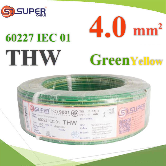 100 เมตร สายไฟ THW 60227 IEC01 ทองแดงฉนวนพีวีซี ขนาด 4 Sq.mm. กราวด์ สีเขียว-เหลือง