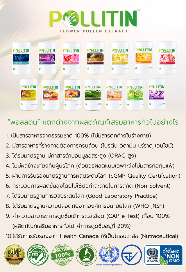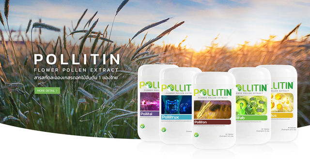 Pollitin คือ สารสกัดธรรมชาติคุณภาพสูง สกัดจากอณูละอองเกสรดอกไม้ ภายใต้การผลิตและวิจัยด้วยเทคโนโลยีที่มี มาตรฐานเดียวกับการผลิตยาตามข้อกำหนดขององค์การอนามัยโลก จึงได้รับการขึ้นทะเบียนเป็น “NUTRACEUTICAL” หรือ “โภชนเภสัช สารอาหารบำบัด” ที่ได้รับค่ามาตรฐาน ORAC หรือ ค่าระดับความเข้มข้นของสารต้านอนุมูลอิสระ และ ค่า CAP-e Test หรือ ค่าความสามารถในการดูดซึมเข้าสู่เม็ดเลือดแดง ในระดับที่สูงมาก