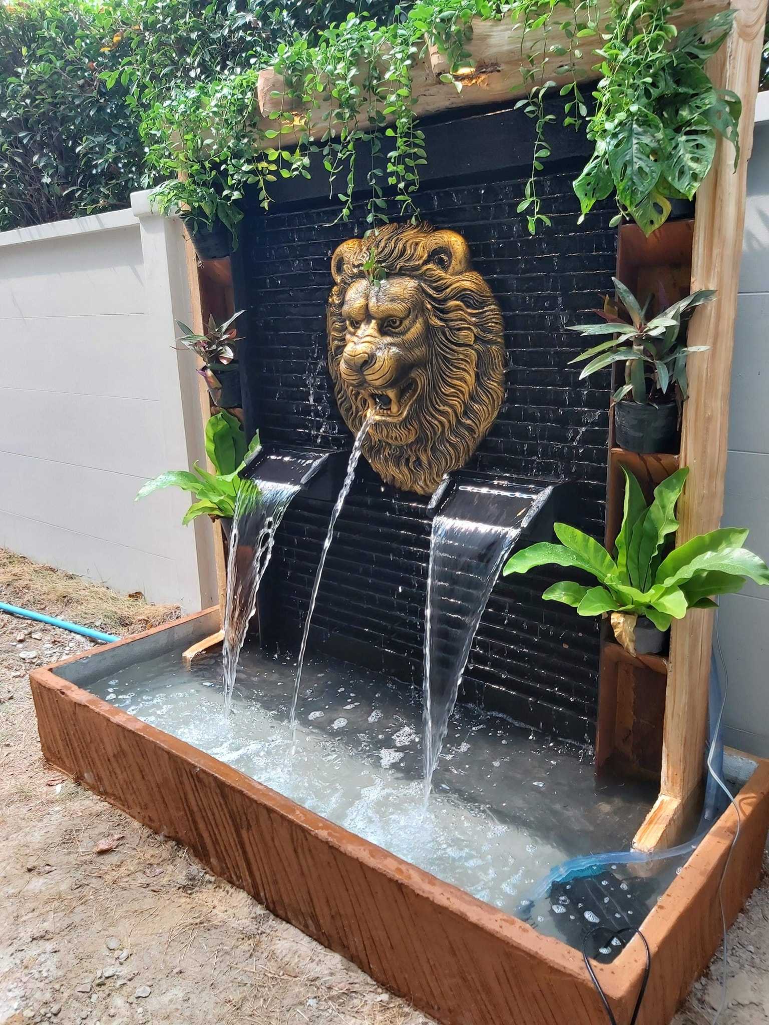 ม่านน้ำตกสีน้ำตาล ติดหัวสิงห์โตพ่นน้ำ