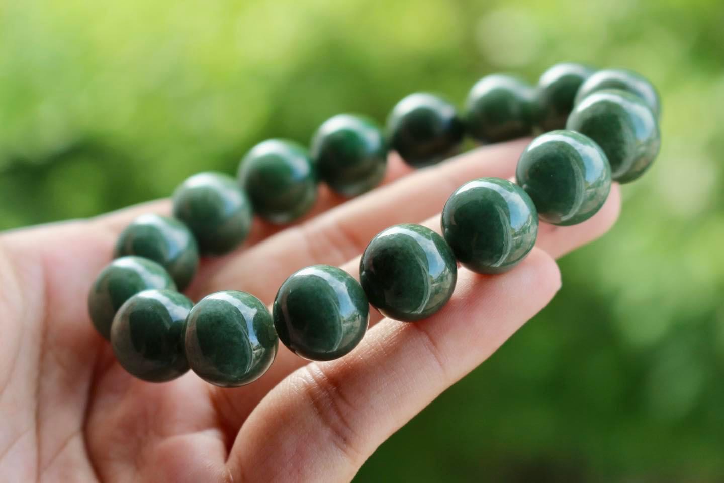 สร้อยข้อมือหยกเขียวผักโขมเนื้อหยกเนียนกริบ ส่องไฟผ่านทุกเม็ด เม็ดกลมสวย 100% ไร้ตำหนิ ไร้รอยแตกบิ่น