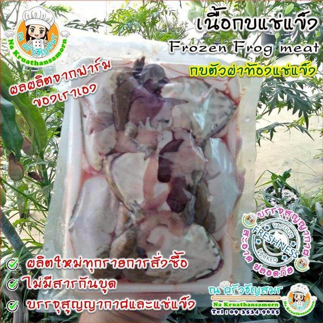 - การจัดส่ง "เนื้อกบแช่แข็ง" (Frozen Frog meat) ด้วยขนส่งเอกชน ทางร้านห่อหุ้มถุงบรรจุอาหารแบบสูญญากาศ ด้วยอลูมิเนียมฟอล์ยเก็บความเย็นก่อนหนึ่งชั้นด้านใน และห่อทับด้านนอกด้วยแผ่นฉนวนเก็บความเย็น (insulation Aluminium Foil) อีกครั้ง ก่อนบรรจุลงกล่อง เพื่อรักษาอุณหภูมิให้คงที่ตลอดการเดินทาง