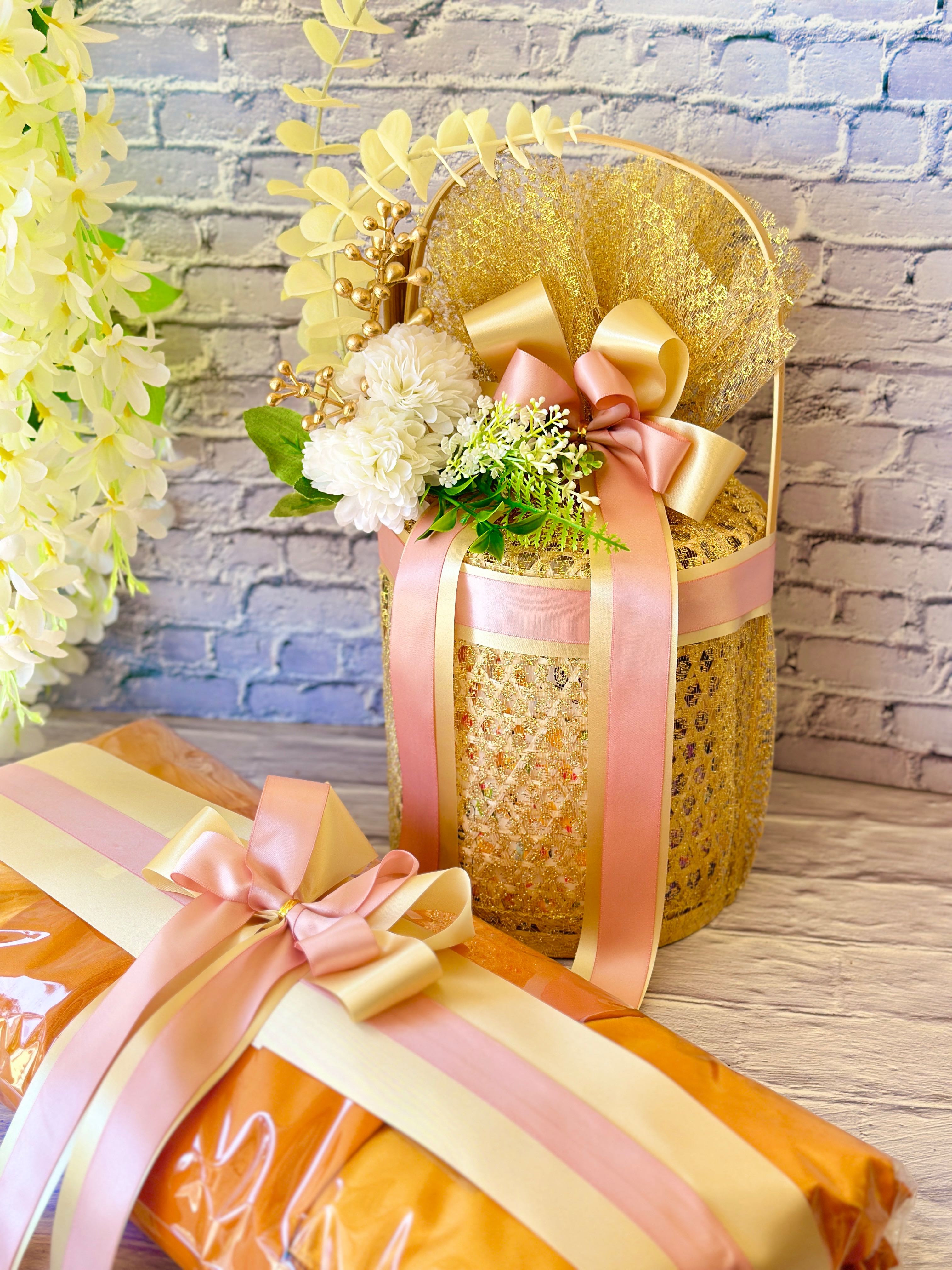 ปิ่นโตขนาด7" ตกแต่งดอกไม้ใบกิ่งโกะ และห่อผ้าทองผูกริบบิ้น