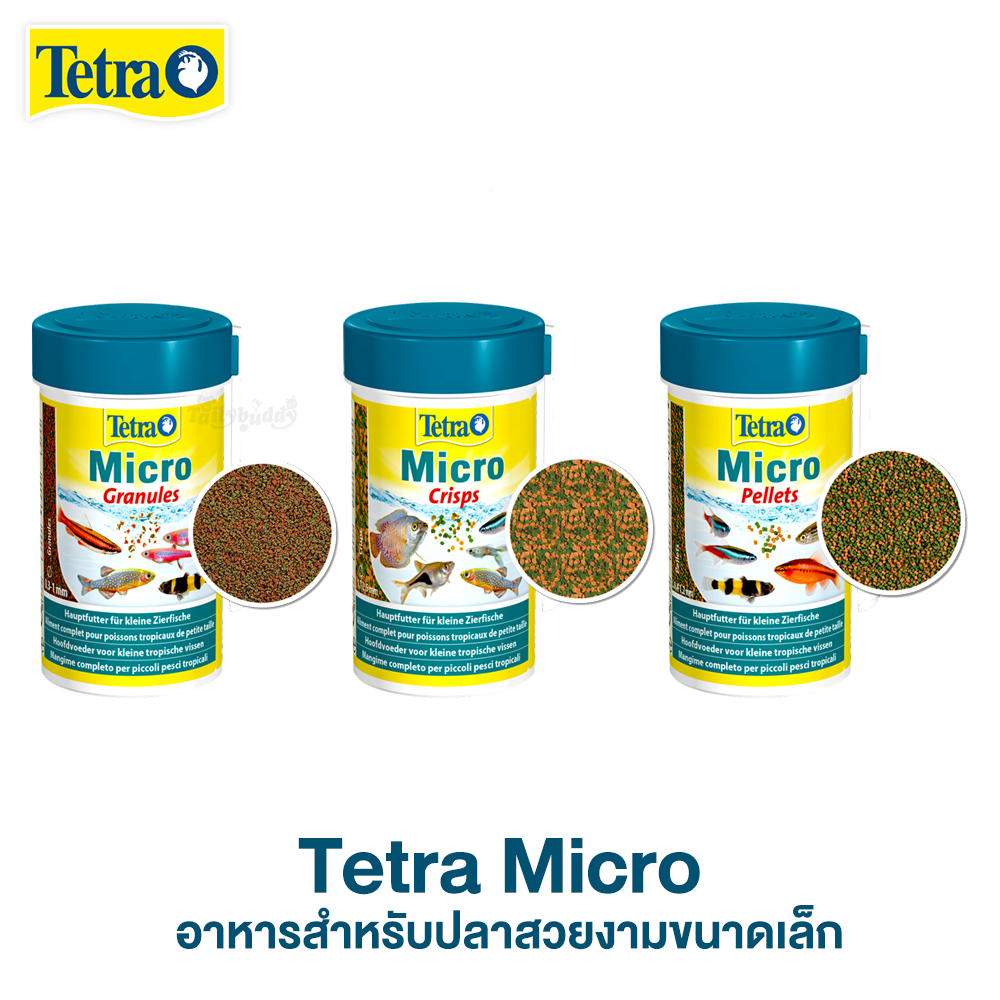 Tetra Micro Pellets อาหารสาหรับปลาเขตร้อนขนาดเล็ก เป็นอาหารชนิดเม็ดแบบจมช้า มีเส้นผ่านศูนย์กลาง 0.4 ถึง 1.2 มม.