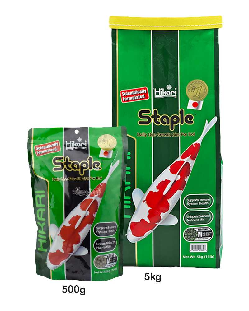Hikari Growth & Maintenance Diet Staple อาหารปลาคาร์ฟ เม็ดกลาง (500g.) คุณสมบัติช่วยในเรื่องของการเจริญเติบโตมีสารอาหารที่ช่วยเสริมสร้างสุขภาพของระบบภูมิคุ้มกันA Daily Diet For Koi A high quality, basic daily diet made from premium ingredients offering superior growth and health improving characteristics.FEATURESHikari® Staple™ is a lab formulated, daily diet, for feeding Koi and other pond fish in warmer water temperatures. The uniquely balanced ingredients support rapid growth, proper form and efficient utilization. This floating diet will not cloud your water and contains necessary vitamins, including stabilized vitamin C to support immune system health. Note: Hikari® Staple™ contains higher levels of natural ingredients which may cause a slight change in color from one production lot to another. Re