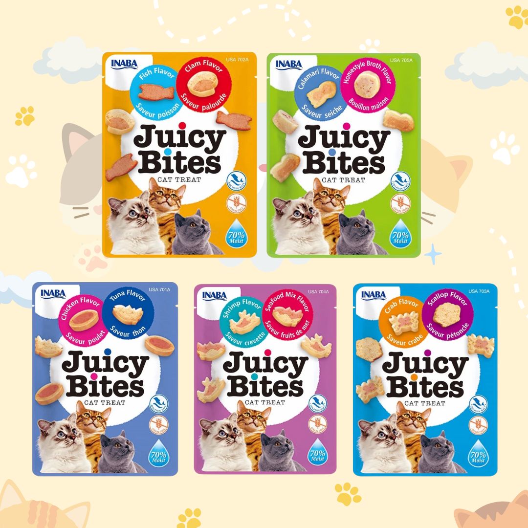 Inaba Juicy Bites ขนมแมวเนื้อนุ่ม รูปทรงหลากหลาย หอม อร่อย มีทั้งหมด 5 รสชาติรสปลาทูน่าและไก่รสปลาและหอยลายรสหอยเชลล์และปูรสกุ้งและซีฟู้ดมิกซ์รสน้ำซุปแบบโฮมสไตส์และปลาหมึกผลิตจากปลาทูน่าและเนื้อไก่ปราศจากธัญพืช สีสังเคราะห์ และวัตถุกันเสียเนื้อนุ่ม รสชาติที่น้องเหมียวชอบทางเลือกใหม่ๆ ในการใช้เวลากับน้องเหมียววิธีและขนาดการใช้ : แมวโตอายุ 1 ปีขึ้นไป น้ำหนัก 2.5-4.0 กิโลกรัม ให้กินวันละ 50-100 กรัม และให้อาหารสำเร็จรูปอื่นเพิ่มเติมเพื่อให้แมวได้รับสารอาหารเพียงพอต่อความต้องการของร่างกายMade in Thailand