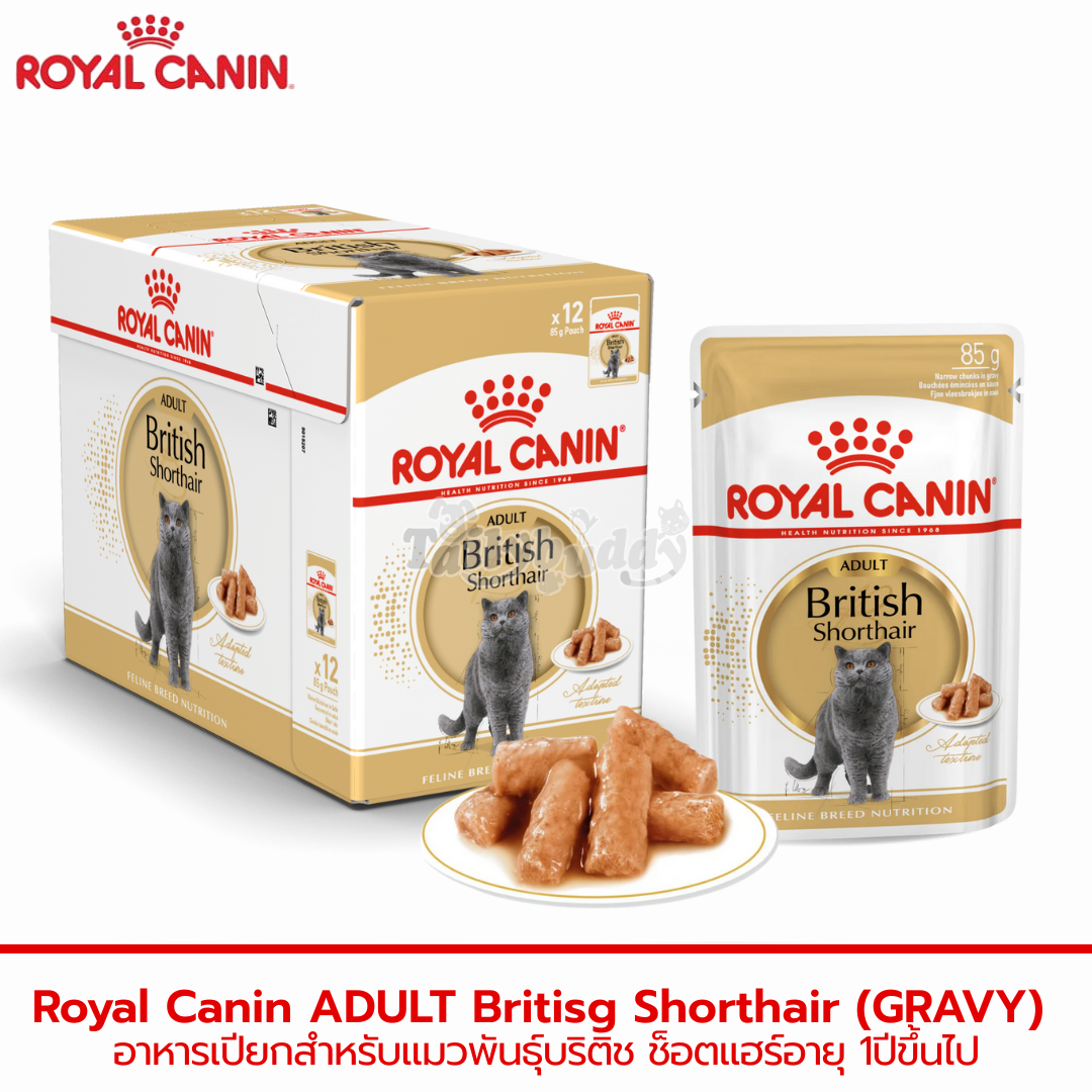 ROYAL CANIN® British Shorthair Adult in Gravy ได้รับการคิดค้นสูตรเป็นพิเศษ โดยคำนึงถึงความต้องการทางโภชนาการของแมวพันธุ์บริติช ชอร์ตแฮร์โดยเฉพาะ แมวบริติช ชอร์ตแฮร์มีลักษณะลำตัวแข็งแรง หนักแน่น และมีกล้ามเนื้อเป็นหลัก ตามธรรมชาติแล้ว น้ำหนักตัวที่เหมาะสมควรมาจากมวลกล้ามเนื้อ ไม่ใช่ไขมัน ดังนั้นการได้รับสารอาหารที่เหมาะสม รวมถึงปริมาณอาหารที่ถูกต้องจึงมีความสำคัญอย่างยิ่งสูตรนี้มีความสมดุลของสารอาหารที่จำเป็น รวมถึงวิตามินหลากหลายชนิด ช่วยบำรุงผิวหนังให้แข็งแรงและขนดูสุขภาพดี เงางามคุณประโยชน์ผิวหนังและขนสุขภาพดี ช่วยดูแลและคงความแข็งแรงของผิวหนังและเส้นขนพลังงานเหมาะสม ปรับปริมาณไขมันให้เหมาะกับรูปร่างที่แข็งแรง หนักแน่น และมีกล้ามเนื้อของแมวบริติช ชอร์ตแฮร์ ช่วยควบคุมน้ำหนักอย่างมีประสิทธิภาพระบบทางเดินปัสสาวะสุขภาพดี ช่วยดูแลและสนับสนุนระบบทางเดินปัสสาวะให้แข็งแรงส่วนประกอบ ผลพลอยได้จากไก่, ผลพลอยได้จากสุกร, แซลมอน, แป้งสาลี, แร่ธาตุ, วิตามิน, เซลลูโลส, แป้งข้าวโพด, น้ำมันปลา, ดอกดาวเรืองปั่น, ยีสต์ (แหล่