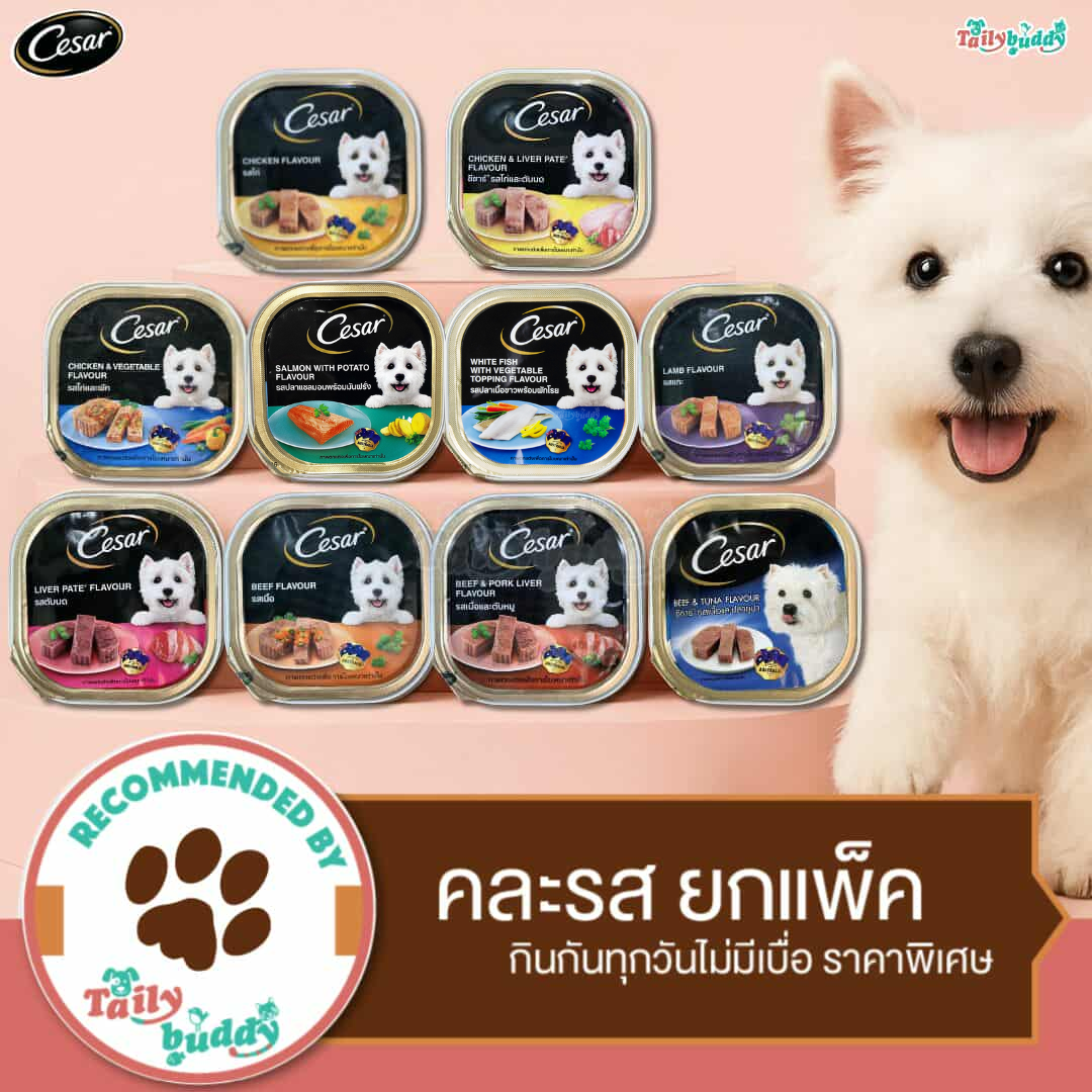 Cesar อาหารเปียกสำหรับสุนัขอายุ 1 ปี ขึ้นไป ใช้วัตถุดิบที่มีคุณภาพที่ได้รับการคัดสรรมาอย่างดีคลุกเคล้าเป็นเมนูที่เปี่ยมด้วยคุณค่า ให้โปรตีน และสารอาหารที่จำเป็น นอกจากอาหารจะอร่อยแล้วยังมีประโยชน์กับสุนัขอีกมากเพราะมีส่วนประกอบสำคัญมากมาย เช่น เนื้อไก่, เนื้อวัว, ผัก, เจล, น้ำมันเมล็ดดอกทานตะวัน, แร่ธาตุ, สารปรุงแต่งกลิ่นรส, สารถนอมคุณภาพ และวิตามิน ปรุงรสอย่างกลมกล่อมลงตัวและให้โปรตีนกับสุนัขของท่านอย่างแน่นอน ปริมาณอาหารที่ให้ต่อวัน สุนัขน้ำหนัก 1-5 กก. 1-3 ถาดต่อมื้อ , 5-10 กก. ให้ 3-5 ถาดต่อมื้อและน้ำหนัก >10กก. ขึ้นไป ให้5ถาดต่อมื้อ ขึ้นไป(ควรให้ 2 มื้อต่อวัน) Cesar อาหารเปียกสุนัข คละ 8 รส ดังนี้ รสเนื้อไก่รสเนื้อไก่และตับบด รสเนื้อไก่และผักรวม รสปลาแซลม่อนพร้อมมันฝรั่ง รสปลาเนื้อขาวและผัก รสแกะรสตับบด รสเนื้อรสเนื้อวัวและตับหมูรสเนื้อวัวและปลาทูน่า ขนาด 100 กรัม/1 ถาด