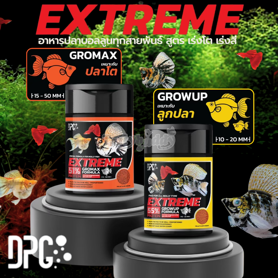 DPG Extreme อาหารปลาบอลลูน สูตรเร่งโต เร่งสี เหมาะกับปลาบอลลูนทุกสายพันธุ์ สำหรับปลาบอลลูนขนาดเล็กที่บอบบาง โดยฉพาะด้วยโปรตีน 51% GROMAX(กระปุกส้ม) และโปรตีน 55% GROWUP(กระปุกเหลือง) ที่มาจากปลาทะเล คริลล์ และสาหร่ายสไปรูลินา ช่วยส่งเสริมการเจริญเติบโต โครงสร้างที่แข็งแรง สีสันสดใส และการย่อยที่มีประสิทธิภาพเสริมด้วยแอสตาแซนธินเข้มข้น สารสสกัดกระเทียมธรรมชาติ และโปรไบโอติกส์ เพื่อเสริมสร้างภูมิคุ้มกันให้แข็งแรง 1. DPG Extreme Growup Formula (กระปุกเหลือง) มีส่วนผสมจากปลาทะเล คริลล์ ช่วยการเจริญเติบโต โครงสร้างแข็งแรง มีส่วนผสมสาหร่ายสไปรูลิน่า และ แอสตาแซนธินเข้มข้น ช่วยให้ปลามีสีสันที่สดใส มีส่วนผสมสารสกัดจากกระเทียมธรรมชาติ และโปรไบโอติก เพิ่มการย่อยอย่างมีประสิทธิภาพ เพิ่มเสริมคุ้มกันให้ปลามีสุขภาพที่แข็งแรง ไม่ก่อให่เกิดน้ำขุ่น Guaranteed Analysis crude protein min 55% crude fat min 6.5% crude fiber max 4% crude moisture max 12% IngredientsWhole fish meal, wheat germ meal, soybean meal, wheat flour, com gluten meal, kill med brewer dried yeast, fish oil, spirulina, garlic, DL-methionine, astaxanthin, muttam and minerals, probiotics. วิธีใช้ ให้อาหาร วันละ 1-2 ครั้ง ในปริมาณที่ปลากินหมดภายในไม่กี่นาที หากเหลืออาหารในตู้ ควรตักออกเพื่อลดการเน่าเสีย เมื่อปลาเริ่มโตหรือมีความต้องการสูง อาจเพิ่มความถี่ — แต่ต้องคุมคุณภาพน้ำให้อยู่ในเกณฑ์ดี ใช้ควบคู่กับอาหารประเภทอื่น ๆ เพื่อให้โภชนาการครบถ้วนในระยะยาว ลักษณะเม็ด: เม็ดจมช้า เหมาะสำหรับปลาขนาด: 10-20 mm (เหมาะกับปลาเล็ก) ขนาด 80g 2. DPG Extreme Gromax Formula (กระปุกส้ม) มีส่วนผสมจากปลาทะเล คริลล์ ช่วยการเจริญเติบโต โครงสร้างแข็งแรง มีส่วนผสมสาหร่ายสไปรูลิน่า และ แอสตาแซนธินเข้มข้น ช่วยให้ปลามีสีสันที่สดใส มีส่วนผสมสารสกัดจากกระเทียมธรรมชาติ และโปรไบโอติก เพิ่มการย่อยอย่างมีประสิทธิภาพ เพิ่มเสริมคุ้มกันให้ปลามีสุขภาพที่แข็งแรง ไม่ก่อให่เกิดน้ำขุ่น Guaranteed Analysis crude protein min 51% crude fat min 6.5% crude fiber max 4% crude moisture max 10% IngredientsWhole fish meal, wheat germ meal, soybean meal, wheat flour, com gluten meal, kill med brewer dried yeast, fish oil, spirulina, garlic, DL-methionine, astaxanthin, muttam and minerals, probiotics. วิธีใช้ ให้ปริมาณเล็กน้อย วันละ 1–2 ครั้ง เหมาะกับปลาในตู้ที่มีคุณภาพน้ำดี ควรเอาอาหารที่เหลือออกไม่ให้ตกค้าง ค่อย ๆ ปรับปริมาณตามขนาดปลาและความอยากอาหาร อาจใช้เป็นอาหารหลักร่วมกับอาหารชนิดอื่นเพื่อให้โภชนาการครบ ลักษณะเม็ด: เม็ดจมช้า เหมาะสำหรับปลาขนาด: 15-50 mm (เหมาะกับปลาโตเต็มวัย)ขนาด 100g