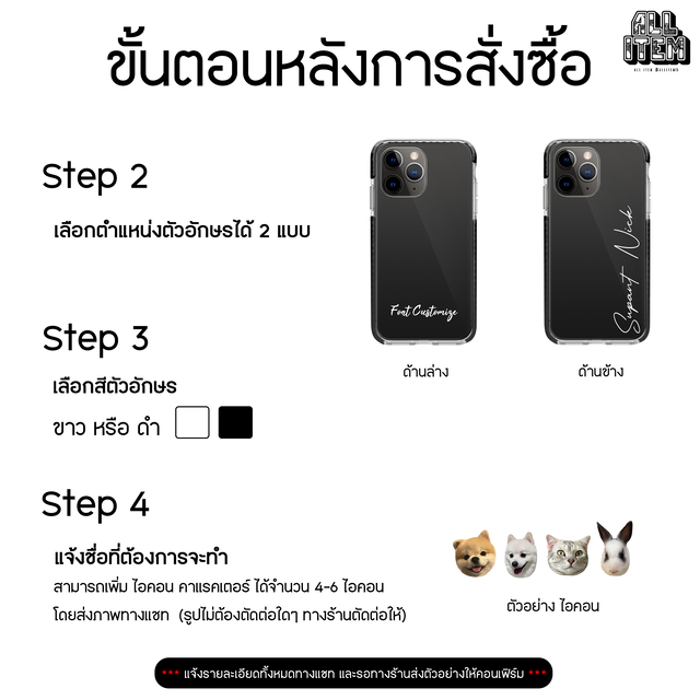 - ทางร้านจะทำการออกแบบ Case Creator และส่งกลับไปในแชทให้ลูกค้าคอนเฟิร์มแบบลงผลิต และจัดส่งตามรอบ ตามลำดับ