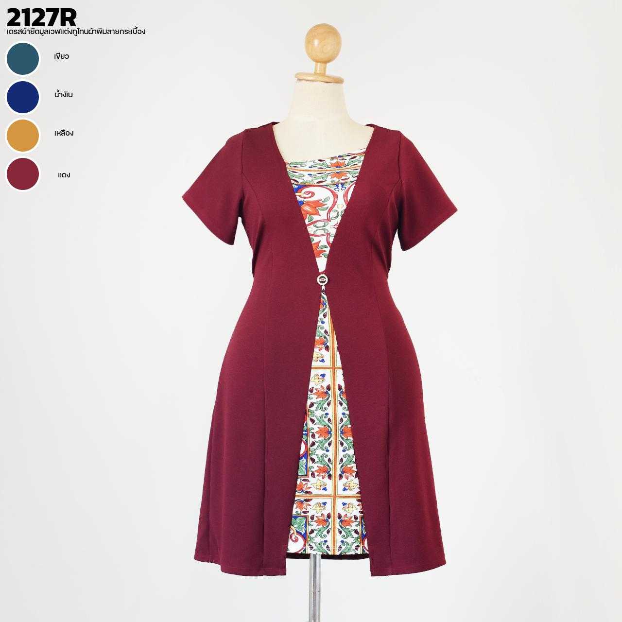 2127R เดรสผ้ายืดมูลเวฟเเต่งทูโทนผ้าพิมลายกระเบื้อง