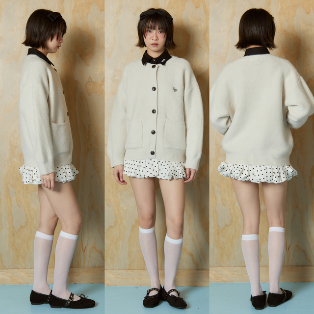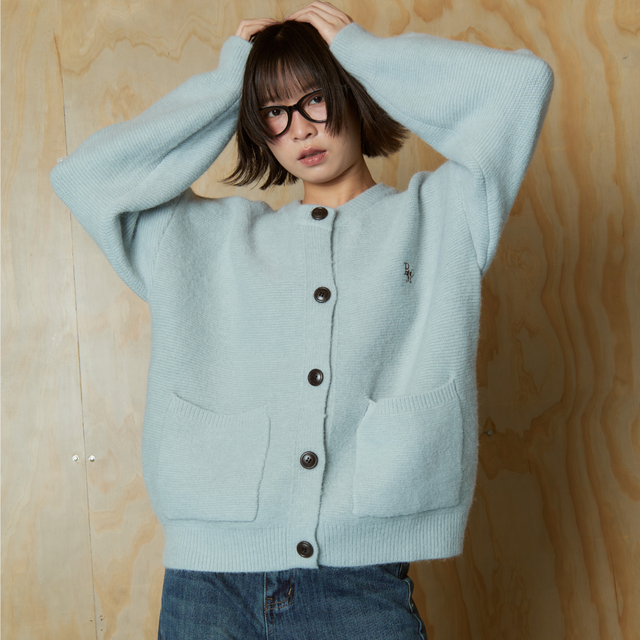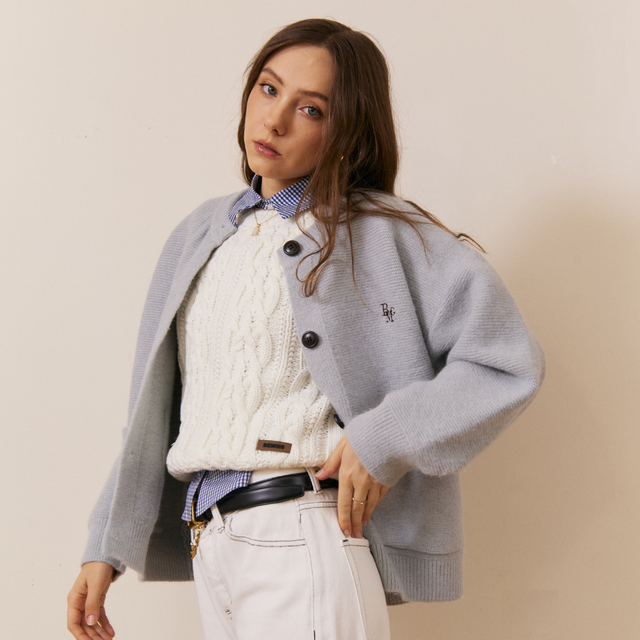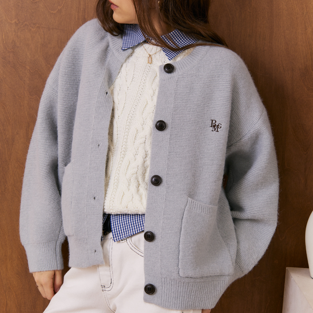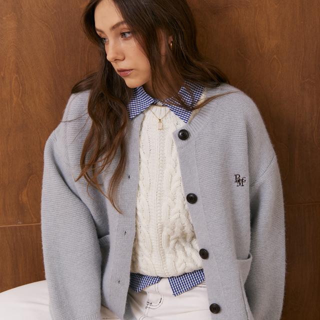 คาร์ดิแกนไหมพรมทรงโอเวอร์เล็กน้อย ทรงเบสิกใส่ง่าย กระดุมหน้าเรียบหรูพร้อมกระเป๋าคู่ด้านหน้า เพิ่มลูกเล่นด้วยโลโก้ BMG ปักเล็ก ๆ ผ้านิ่มไม่บาง แมทช์กับอะไรก็รอด จะใส่เป็น outer หรือเสื้อตัวเดียวก็น่ารัก