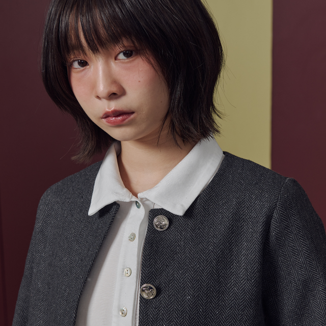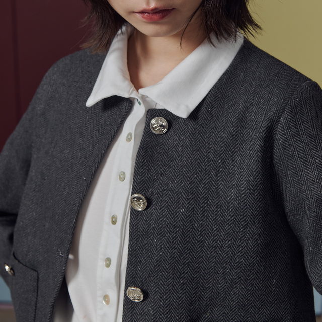 กระดุมเงินเม็ดใหญ่ 4 เม็ด ตรงกลาง ปั๊มนูน BMG เพิ่มความหรูแบบมินิมอล พร้อมกระเป๋าคู่ด้านหน้า ทรงเข้ารูปเล็กน้อย