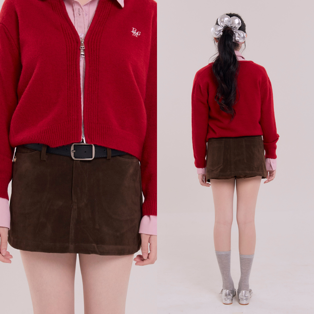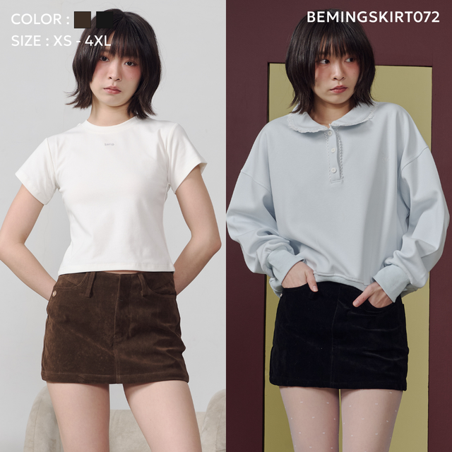 Bemingskirt072(XS-4XL)-BMG Velvet Short - กระโปรงสั้นผ้าดีไซน์กระเป๋าหน้า พร้อมอะไหล่ป้ายโลโก้ BMG
