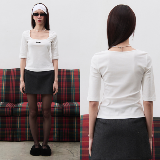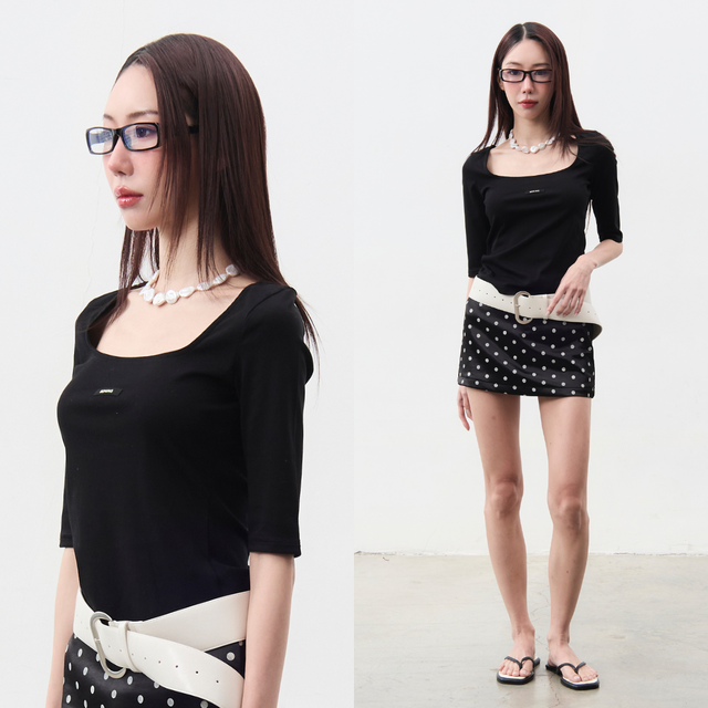 เสื้อแขนสามส่วนทรงเข้ารูป คอกว้างช่วยเปิดช่วงคอและไหล่ ทำให้ลุคดูโปร่ง เรียบร้อยและมีสัดส่วน เนื้อผ้านุ่ม ยืดหยุ่น ใส่สบายทรงพอดีตัว ไม่รัด