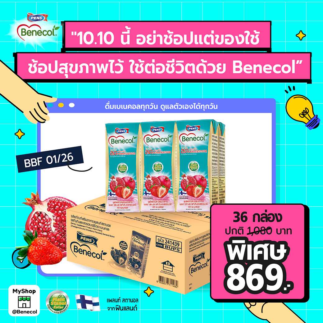 (BBF. 01/26) BENECOL เบเนคอล ผลิตภัณฑ์เสริมอาหารแพลนท์สตานอล ทับทิมและสตรอเบอร์รี่ 36 กล่อง