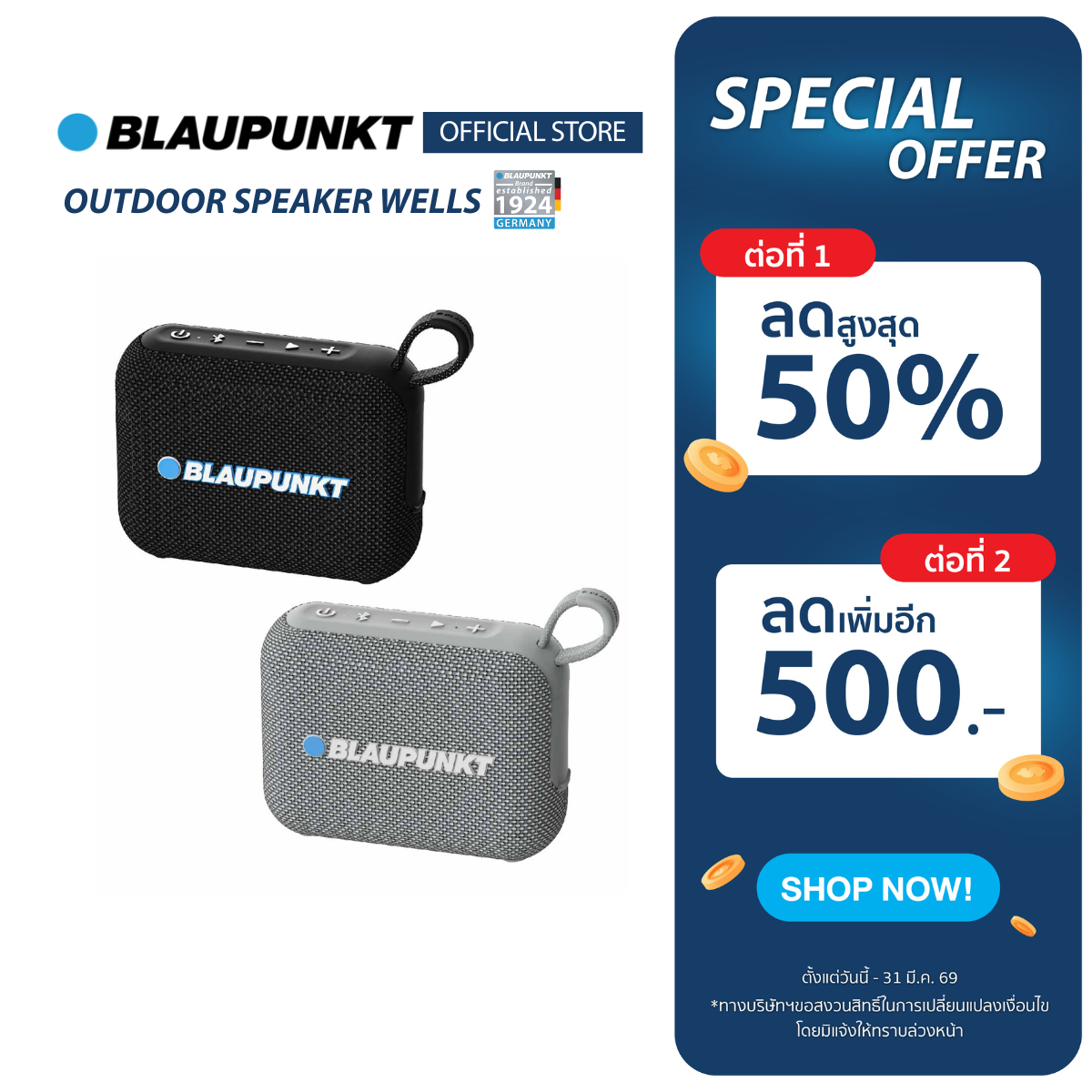 BLAUPUNKT ลำโพงบลูทูธพกพา PORTABLE OUTDOOR รุ่น WELLS