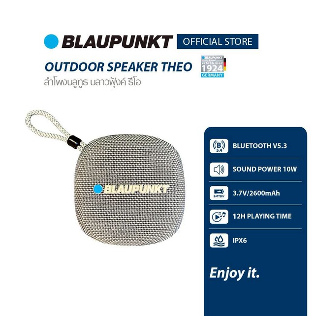 BLAUPUNKT ลำโพงบลูทูธกันน้ำ IPX6 Bluetooth 5.3 กำลังขับ 10 วัตต์ แบตเตอรี่ 2600mAh รุ่น THEO