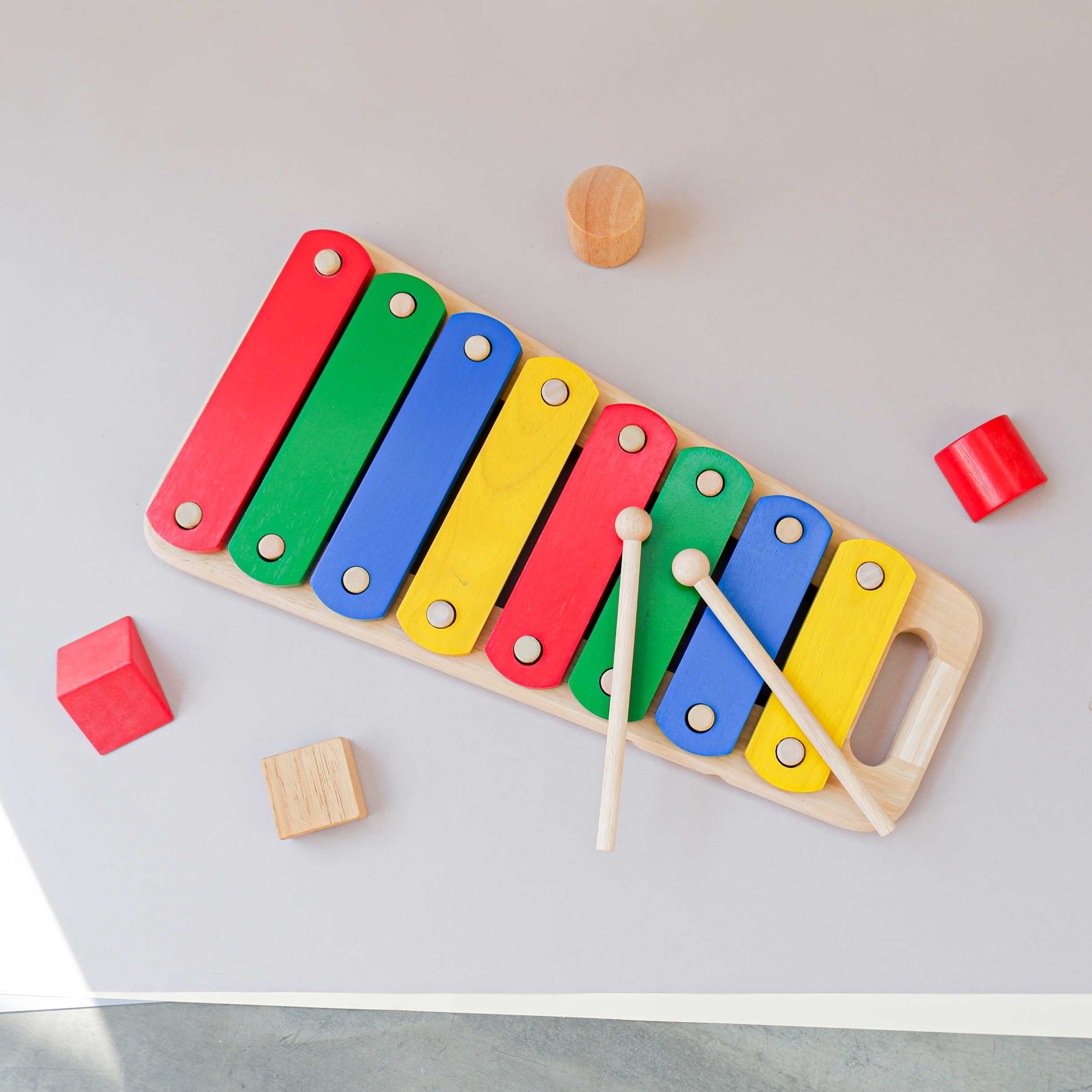 Carry along xylophone with eight color bars mounted on a hardwood base. Come with two mallets.