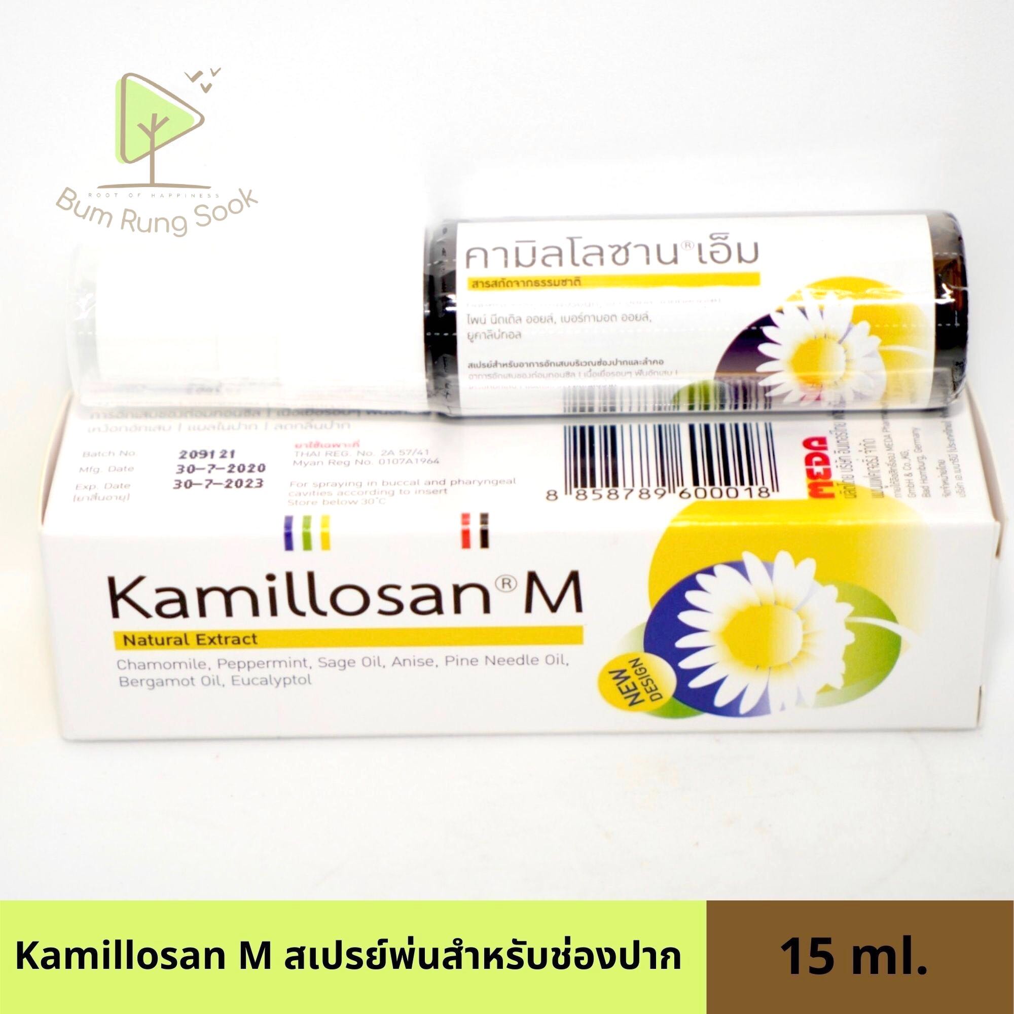 ผลิตภัณฑ์บรรเทาอาการอักเสบบริเวณช่องปากและลำคอโดยมีส่วนประกอบที่สำคัญ คือ ดอกหญ้าหอม (ดอกคาโมไมล์), เพเพอร์มินต์,เซจ ออยล์, เทียนสัตบุษย์, ไพน์ นิดเดิล ออยล์, เบอร์กามอด ออยล์,ยูคาลิปทอล และ เมทิลซาลิไซเลต คุณสมบัติของคามิลโลซานจะช่วยในเรื่องการต่อต้านอาการอักเสบ ซึ่งมีส่วนผสมร่วมกันกับการต่อต้านแบคทีเรียของน้ำมันหอมระเหย ซึ่งอยู่ในรูปแบบที่ละลายน้ำจึงเหมาะสำหรับอาการอักเสบของบริเวณช่องปากและลำคอ Kamillosan M spray สเปรย์ สำหรับช่องปากและลำคอ 15 ml.