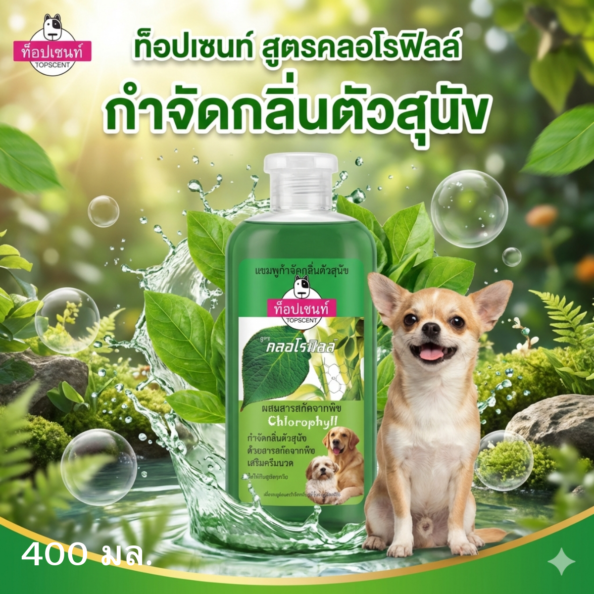 แชมพูสุนัขท็อปเซนท์ สูตรคลอโรฟิลล์กำจัดลิ่นตัว สำหรับน้องหมาตัวเหม็นโดยเฉพาะ ขนาด 400 มล.