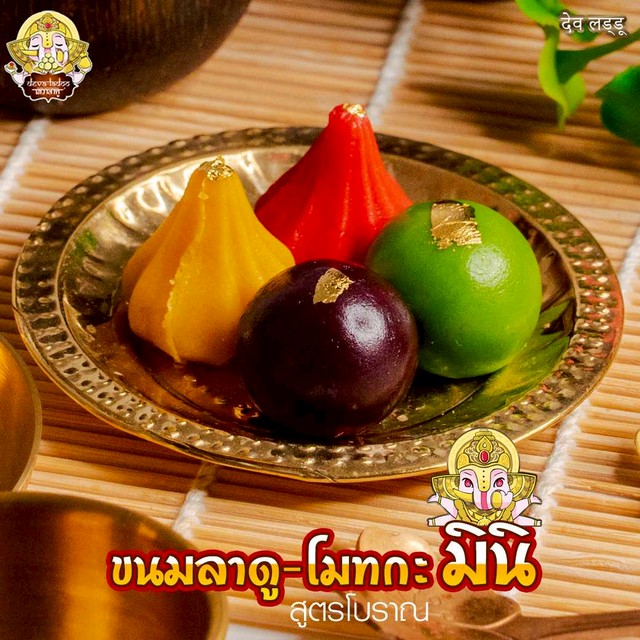 “ขนมลาดู โมทกะสูตรโบราณ ขนาดจิ๋ว มินิ จากอินเดียที่พัฒนาสูตร มาอย่างต่อเนื่อง จนสำเร็จเป็นลาดู โมทกะ สูตรขายดีที่สุด คัดสรรวัตถุดิบเกรดพรีเมี่ยม ทำให้ได้ขนม สูตรโบราณที่เนื้อเนียน สีสันสวยงาม (ลาดูมีแผ่นทองติดด้านบน)