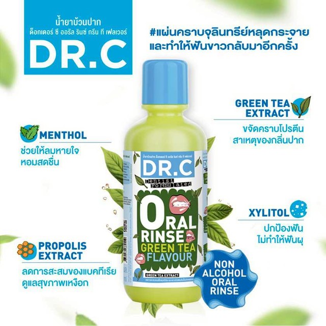 DR.C Oral Rinse น้ำยาบ้วนปากสูตรไร้แอลกอฮอล์ กลิ่นสมุนไพรชาเขียวหอมละมุน ที่ประกอบด้วยส่วนผสมพิเศษ ช่วยกำจัดคราบจุลินทรีย์ให้เห็นกันชัดๆ เพียงอมน้ำยาไว้ 20 วินาที ช่วยให้ลมหายใจหอมสดชื่น ลดการสะสมของเชื้อแบคทีเรีย ตัวช่วยดูแลสุขภาพเหงือกและฟัน