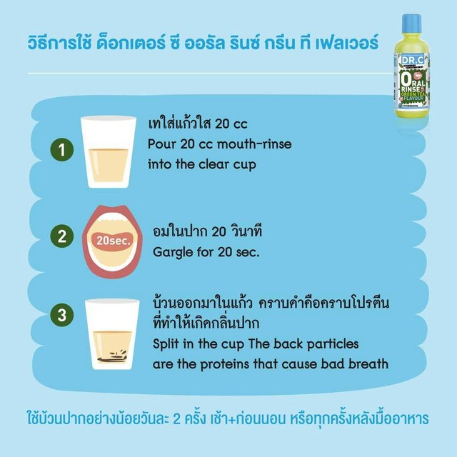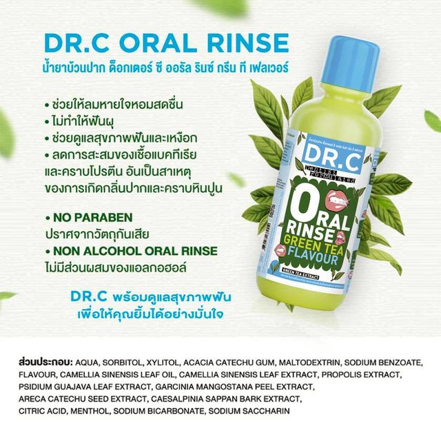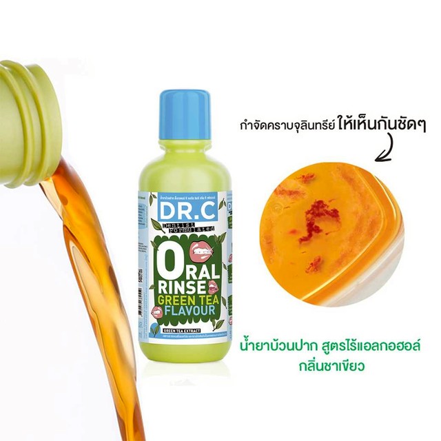 DR.C Oral Rinse น้ำยาบ้วนปากสูตรไร้แอลกอฮอล์ กลิ่นสมุนไพรชาเขียวหอมละมุน ที่ประกอบด้วยส่วนผสมพิเศษ ช่วยกำจัดคราบจุลินทรีย์ให้เห็นกันชัดๆ เพียงอมน้ำยาไว้ 20 วินาที ช่วยให้ลมหายใจหอมสดชื่น ลดการสะสมของเชื้อแบคทีเรีย ตัวช่วยดูแลสุขภาพเหงือกและฟัน