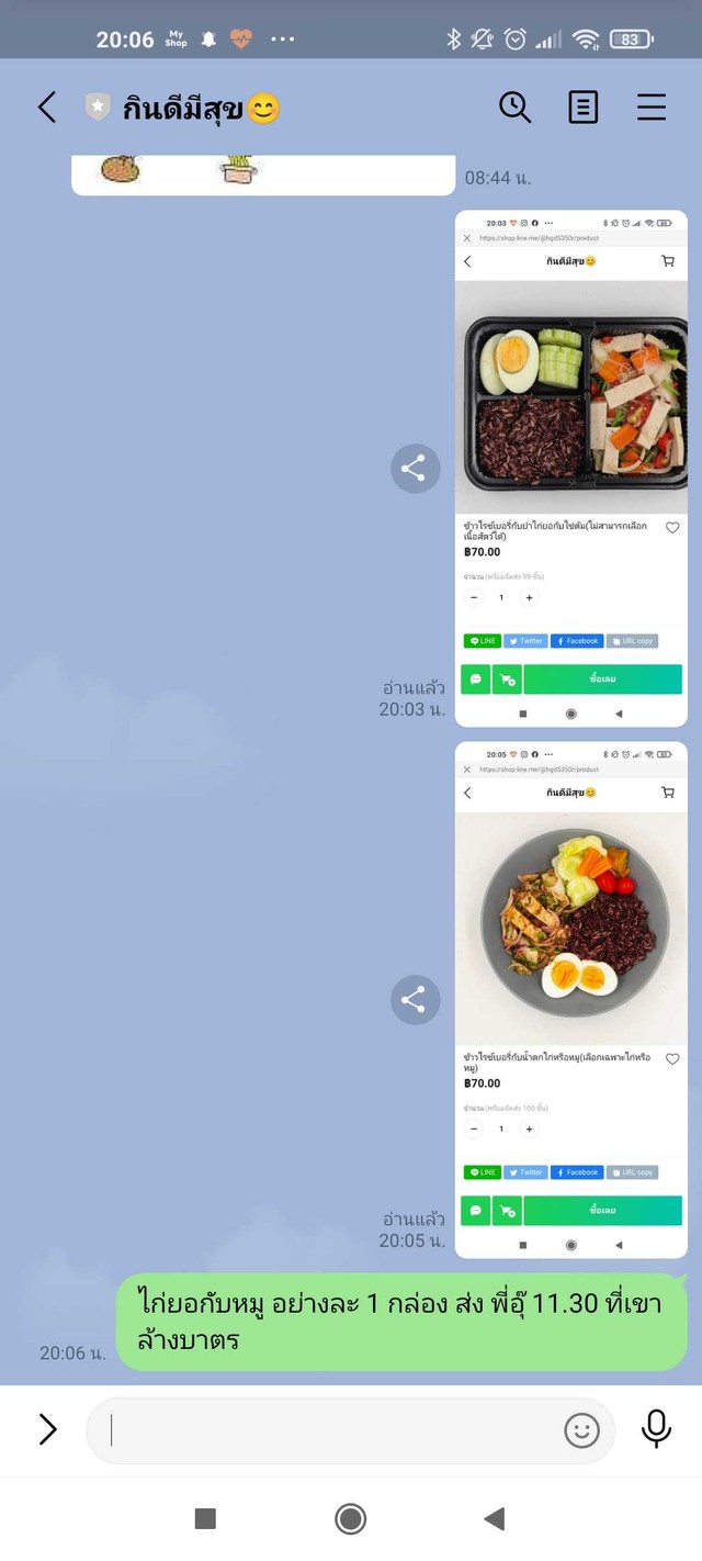 - ลูกค้าแคปหน้าจอสินค้าที่มีรูปภาพแล้วสั่งมาทางแชทไลน์ได้เลย หรือจะพิมพ์รายการอาหารมาเลยตามแต่ลูกค้าสะดวกค่ะ โดยลูกค้าเลือกชนิดเนื้อสัตว์ ชนิดไข่ เวลาที่ให้ไปส่งหรือรับสินค้าค่ะ ระบุเบอร์ติดต่อ