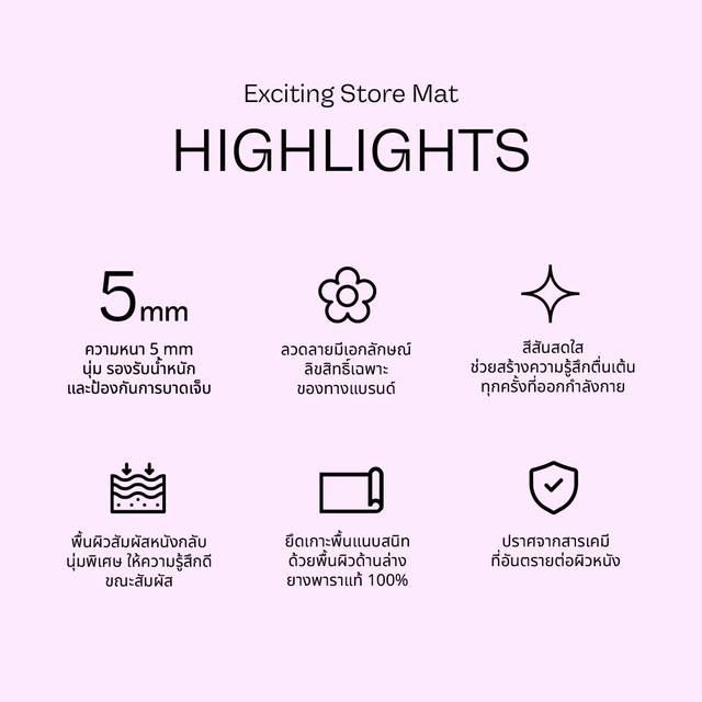 วัสดุพื้นผิว: Vegan Suede (Our's Signature) - พื้นผิวพิเศษของแบรนด์ ตัวพื้นผิวหนังกลับให้ผิวสัมผัสที่นุ่ม แต่คงตัว รองรับน้ำหนักได้ดี เหมาะสำหรับการโยคะ หรือออกกำลังกายทุกรูปแบบ