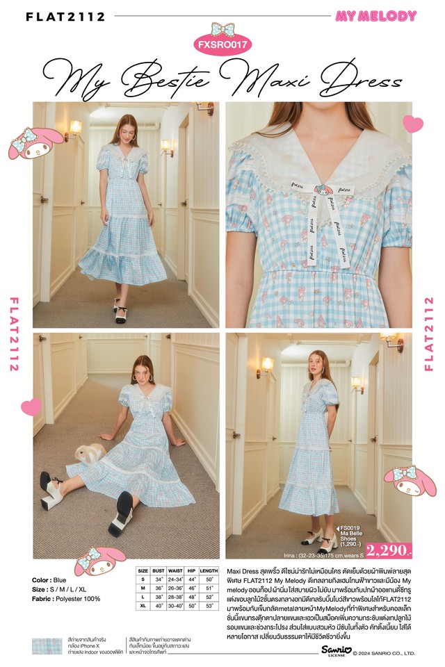Maxi Dress สุดพริ้ว ดีไซน์น่ารักไม่เหมือนใคร ตัดเย็บด้วยผ้าพิมพ์ลายสุดพิเศษ FLAT2112 My Melody ดีเทลลายกิงแฮมโทนฟ้าขาวและมีน้อง My melody ออนท็อป ผ้านิ่ม ใส่สบายผิว ไม่ยับ มาพร้อมกับปกผ้าออแกนดี้ซีทรูแต่งขอบลูกไม้ 2 ชั้น ตรงกลางอกมีดีเทลริบบิ้นโบว์สีขาวพร้อมโลโก้ FLAT2112 มาพร้อมกับเข็มกลัด metal ลายหน้า My Melody ที่ทำพิเศษสำหรับคอลเล็กชั่นนี้ แขนทรงตุ๊กตา ปลายแขนและเอวเป็นสม็อคเพิ่มความกระชับ แต่งเทปลูกไม้รอบแขนและช่วงกระโปรง ส่วมใส่แบบสวมหัว มีซับในทั้งตัว คัทติ้งเนี้ยบ ใส่ได้หลายโอกาส เปลี่ยนวันธรรมดาให้มีชีวิตชีวายิ่งขึ้น