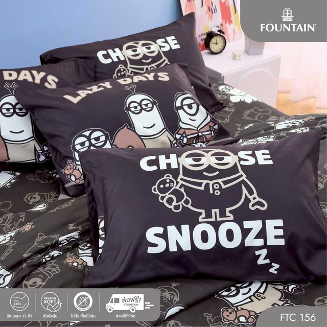 ลายใหม่จาก Fountain FTC156 การ์ตูน Minions ลิขสิทธิ์แท้ จาก Universal พิมพ์ลายเจ้าวายร้ายมินเนี่ยน โทนสีเข้ม ได้อย่างคมชัด โชว์ความเป็นฮีโร่สุดๆให้สัมผัสนุ่มลื่นสบาย ชวนคุณหลับไหลอย่างมีความสุขกับชุดเครื่องนอน Fountain